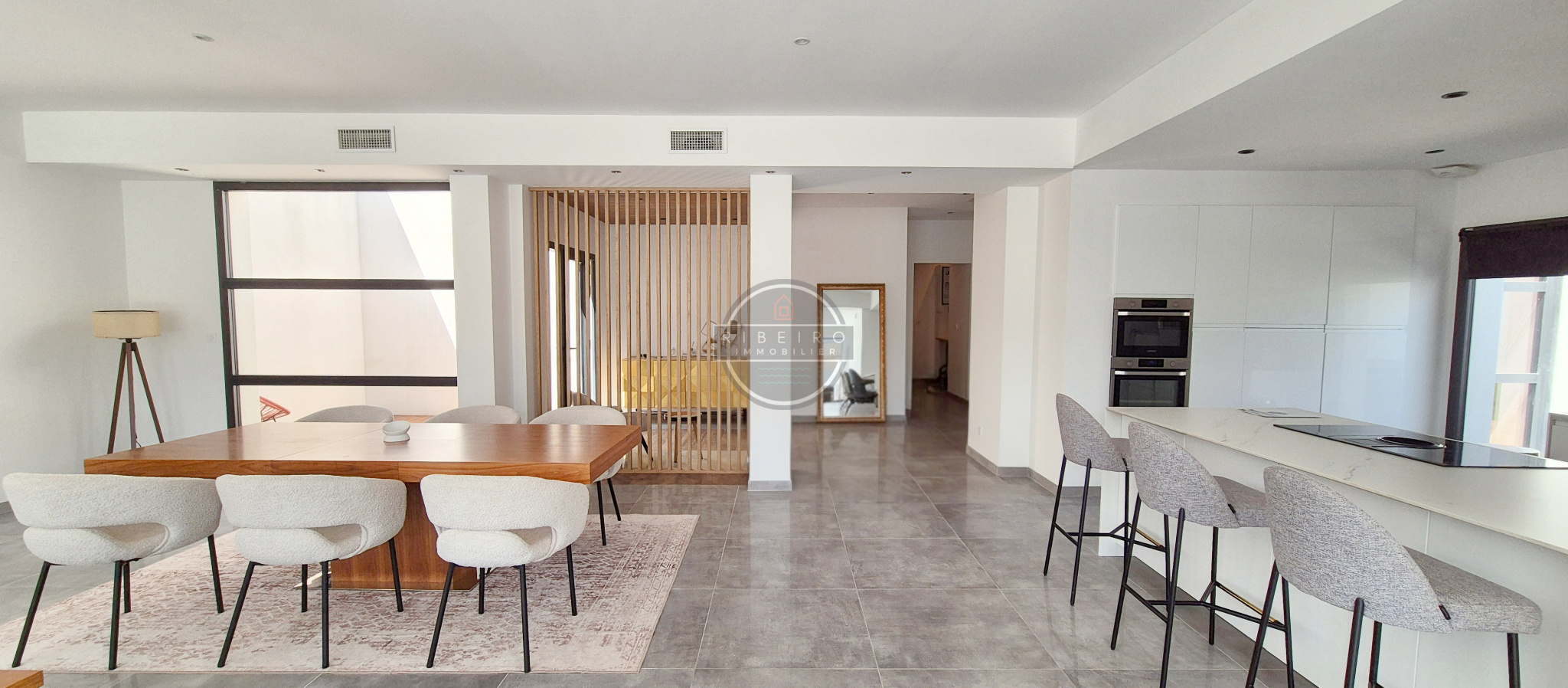 Dès l’entrée, le regard est attiré par les volumes généreux, la belle hauteur sous plafond et la luminosité exceptionnelle de la pièce de vie de 90 m2. Ouvert sur un patio intérieur, cet espace central bénéficie de larges baies vitrées qui prolongent l’habitat vers l’extérieur avec élégance.